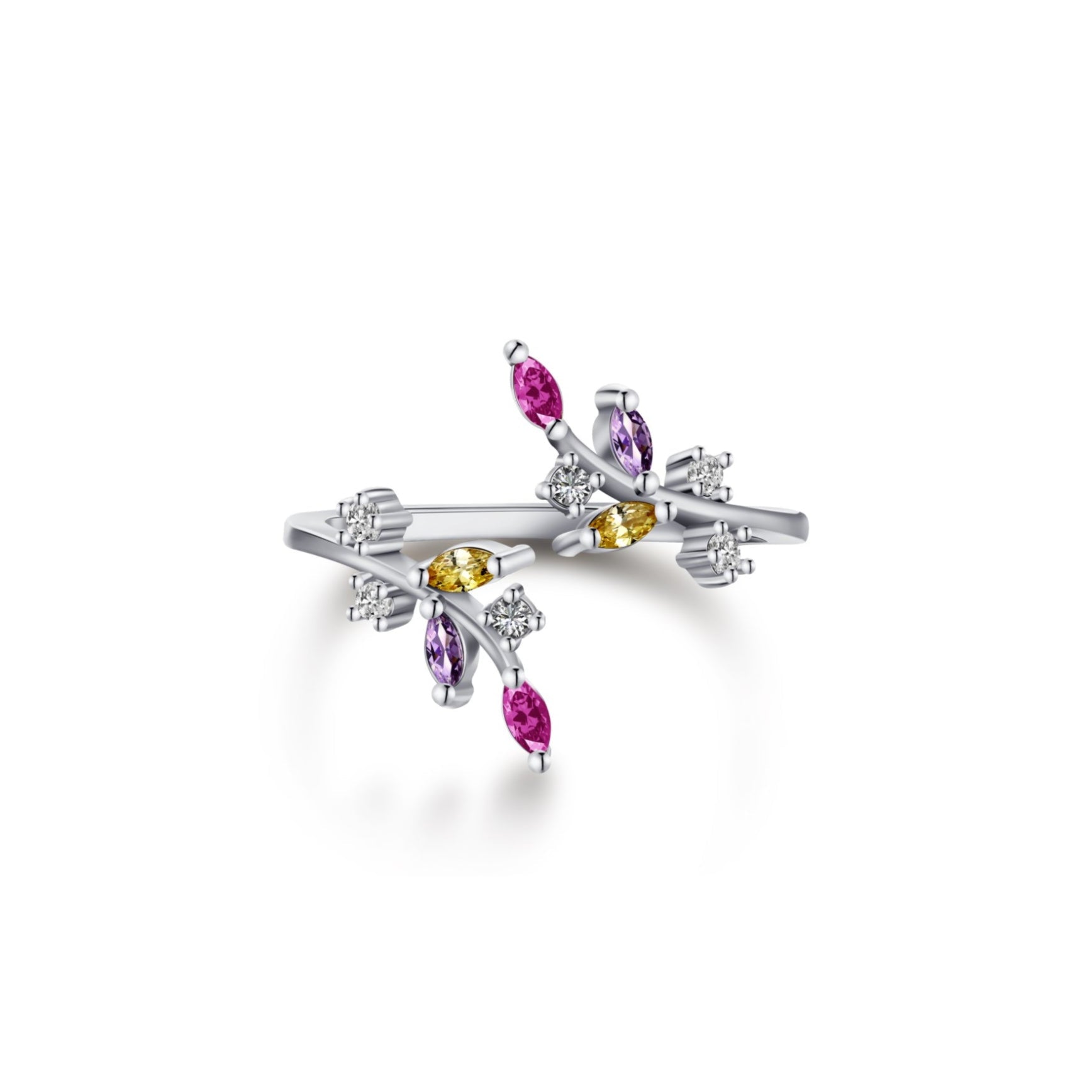 The Blooming Ring showcases vibrant fuchsia, golden yellow, and purple cubic zirconia accented with sparkling clear stones, offering a bold yet elegant statement with its colorful design and adjustable, sterling silver band.